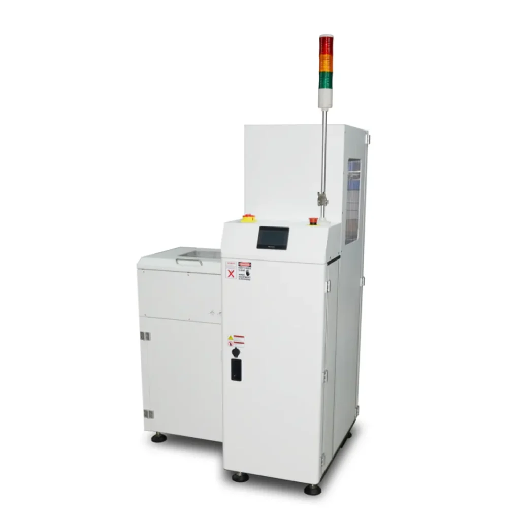 A panelokat a csatlakoztatott szállítószalag gyűjti össze az előző gépből, majd betolja a tárba.