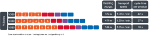a fűtőzóna, a vákuummodul és a hűtőzóna hossza szabadon választható, valamint lehetőség van egy-, két- vagy háromsávos kivitel között választani.
